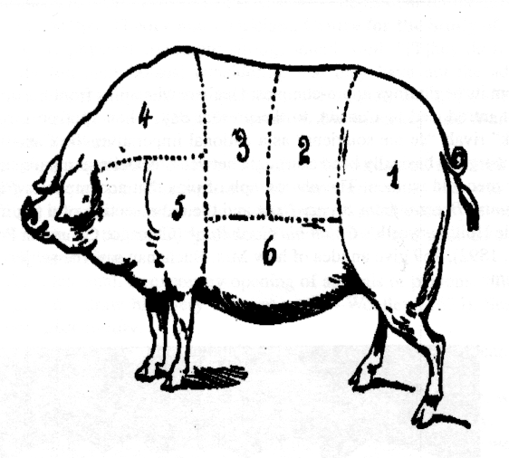 The cheek is usually used for pickling in salt, also the shank or shin. The feet are usually used for souse and jelly. The tail may be boiled or roasted as well. The skin may be deep-fried, although we suggest taht the hair be removed first. The pizzle is generally considered to be too tough for good eating; however, once dried and cured, its unusual corkscrew shape makes it a fascinating, if somewhat vulgar, conversation piece, with the added virtue that its pronounced length has a humbling effect on male pigs of the two-legged variety.